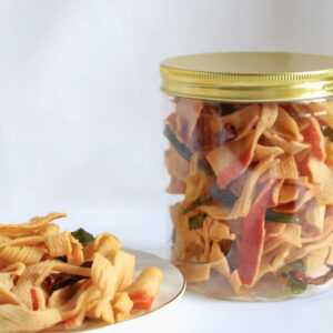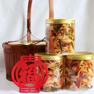 Curry Fried Surimi (咖喱蟹柳片) is a unique CNY snack with a tinge of spiciness that will make you eating non-stop. Crunchy and addictive! The cookies are packed in a transparent plastic jar with aluminum cap, suitable as a gift to friends during Chinese New Year.
